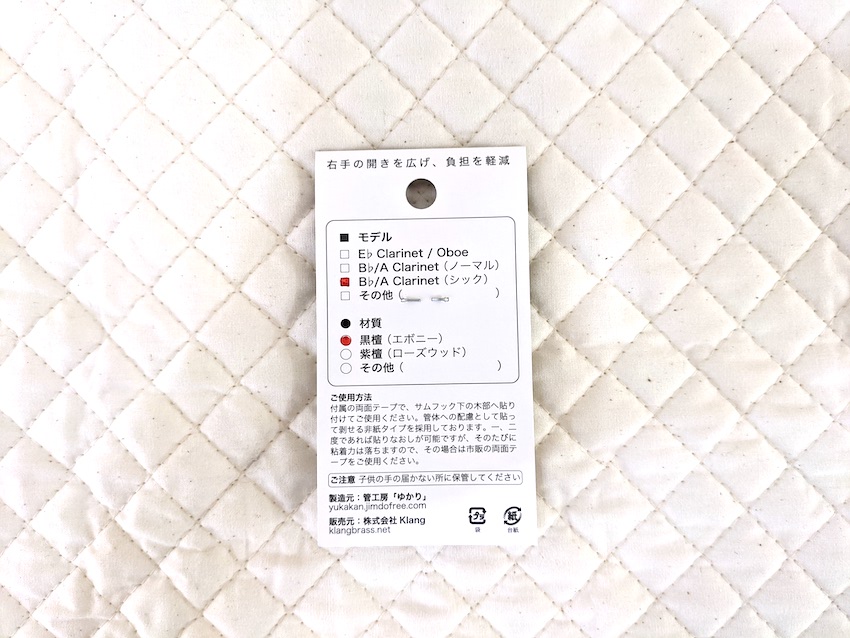 こちらのうどんをB♭・Aクラリネットのサムレスト下あたりに貼り付けるだけで、下管を握った際の手の開きを広げ、右手の負担を変化させます。